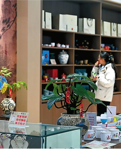 游客在邢白瓷艺术馆挑选茶具。