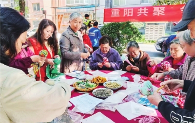 重阳节里社区的老人们围坐一起开茶话会、做艾草保健槌。