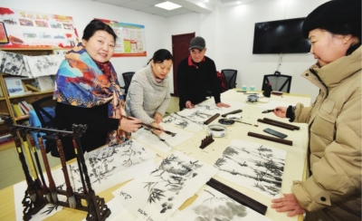社区老年大学水墨书画班学员在老师杨金梅(左)的指导下学习国画。
