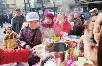 腊八节里,社区为居民赠送热乎乎的腊八粥。