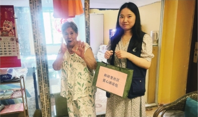社区工作人员上门为老年居民送慰问品。