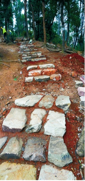正在修建的石阶式山林步道。