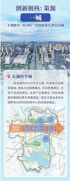 根据方案,武汉将构建以“一城”为创新极核、“三廊”为主要阵地、“多带”为重要支撑的创新空间格局。其中,“一城”即东湖科学城,将聚焦重大科技基础设施集群与高水平实验室体系建设,打造原始创新高地。“三廊”包括光谷科技创新大走廊、车谷产业创新大走廊和武汉滨江数创大走廊,突出“科产融合”,推动创新资源跨廊流动与优势互补,打造产业创新高地。“多带”则以环大学创新发展带为重点,通过高质量城市更新,整合周边空间资源和创新要素,促进科技成果就地转化。