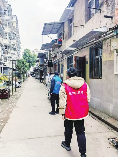 钢管社区工作人员与物业人员在小区内巡查。