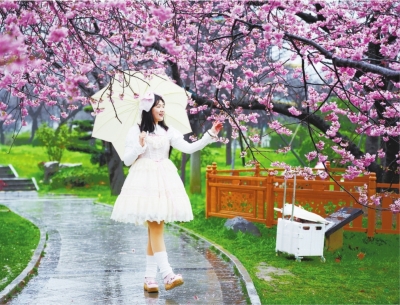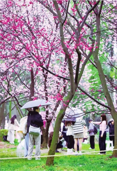 上午开园时分,樱花园内已人气渐旺。春雨中,身着汉服的姑娘们衣袂飘飘,在樱花枝下留影,古典与绚烂相映成趣。孩子们的笑声惊起几片花瓣,在空中打着旋儿落下。几乎每一株绽开花朵的树下,都围着举着手机、相机的游客,试图将今年这“第一抹春色”永久珍藏。