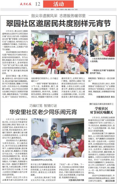 2月28日,青山区红卫路街道翠园社区新时代文明实践站开展“武汉以我为荣·非遗剪纸迎元宵”暨“学雷锋·文明实践我行动”主题活动,将传统文化与志愿服务巧妙融合,为居民送上一场既有文化味、又具烟火气的节日盛宴。