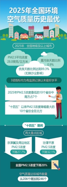 2月27日,记者从生态环境部举行的新闻发布会上获悉,2025年空气质量持续向好,全国环境空气质量历史最优。