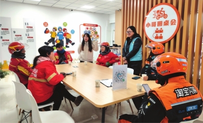 张鹏(左三)在红卫路街道新就业群体服务驿站参加社区圆桌会。