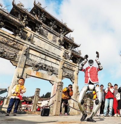 安徽黟县西递古村机器人表演。