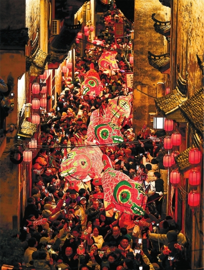 安徽省黄山市歙县瞻淇村鱼灯队在村中表演。