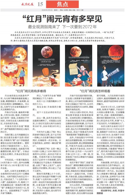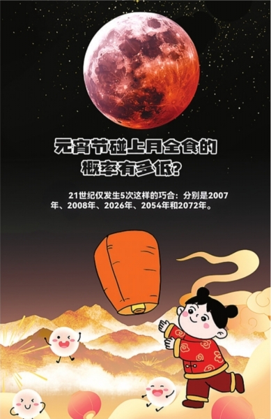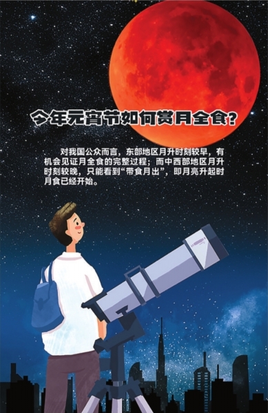 北京天文馆专家表示:这是本年度我国境内可见的“头号天象”,非常值得期待。而且我国大部分地区,只要天气允许,都可以看到红月亮与元宵花灯相映成趣,时间也非常合适,食既为19时4分,正好是元宵佳节的黄金时间段。