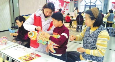 畔湖社区居民在志愿者指导下制作“鱼灯”。