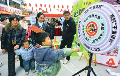 小朋友在太平人寿游戏区玩飞镖转盘游戏。