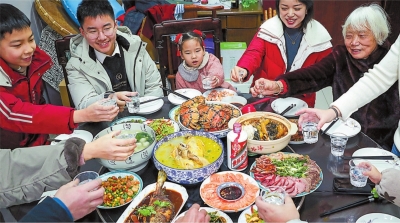 扬州市邗江区荷叶小区内一户人家正在吃年夜饭。
