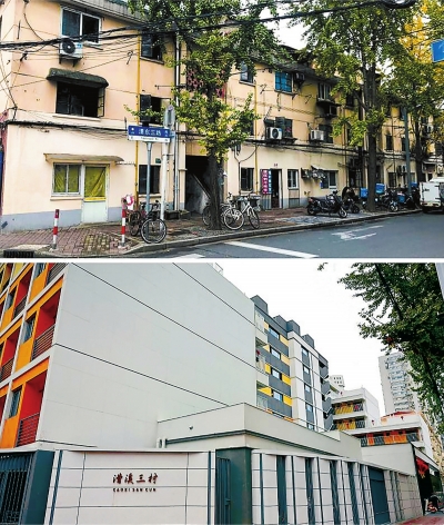 拼版照片:改造前后的上海徐汇区漕溪三村小区居民楼外景。