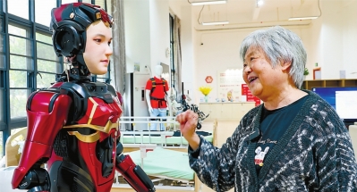 深圳市养老护理院,一名老人与人形机器人“夏澜”互动。