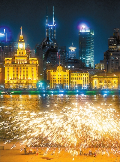 上海浦东新区黄浦江畔,非遗“打铁花”成为亮丽的风景线。