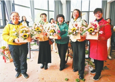 活动现场,居民通过识花语、学养护、花材搭配、插花造型设计等,将一朵朵鲜花创作组合成清新雅致的花艺作品。“花篮的花儿香,听我来唱一唱……”居民刘阿姨边插花边开心地哼起了小曲,多位居民纷纷跟随唱起来,花香四溢,乐声动人。