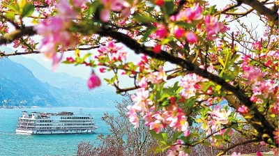 重庆市巫山县境内长江三峡巫峡两岸桃花、海棠花盛开。