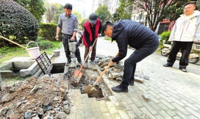 潘正盛(右一)在小区维修破损水管。
