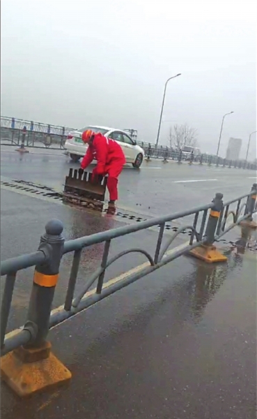 武汉晚报讯(记者刘克取)16日,一段视频在武汉市民的朋友圈中流传。视频中,江夏区金龙大桥桥面一块钢梳齿板翘起,形成“拦路虎”,一名身穿红色雨衣的外卖员在滚滚车流中徒手将钢板复位,并用双脚踩实,确认平整后才默默离开。