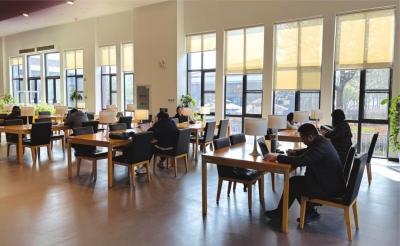 市民罗先生提着一袋书,正在自行操作还书,他指着图书消毒机为图书馆的贴心举动点赞,“考虑得很周到,我在这里借书已经快一年时间了”。图书馆不仅能借阅书籍,还设有几十张自习桌,上午9时,馆内自习区域已座无虚席。落地窗外,就是美好的湖光山色。