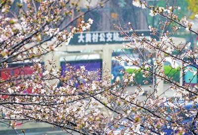 珞喻东路大黄村公交站站台周围的樱花刚刚绽放,上下公交车的市民抬头就可看到雨中绽放的樱花。