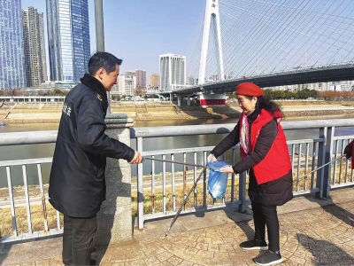 月湖小红帽志愿者巡湖队成员巡湖捡垃圾。
