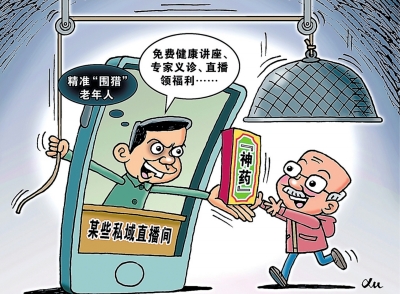 先在短视频平台积累粉丝,再在私域直播间诱惑老年人购买所谓“神药”“神器”……今年“3·15”晚会起底了诸多“私域营销”套路,加之不久前市场监管总局公布了一批私域直播虚假宣传典型案例,一条针对老年群体的灰色产业链正浮出水面。