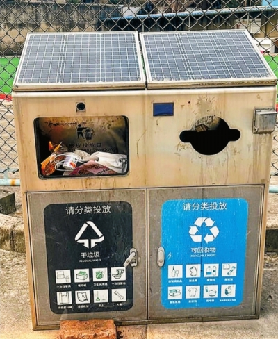 一老旧小区内,智能垃圾箱的感应投放口处于常开状态。