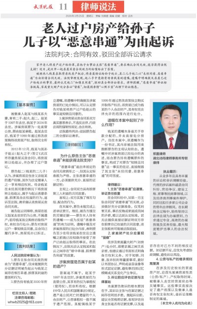 老人过户房产给孙子 儿子以“恶意串通”为由起诉