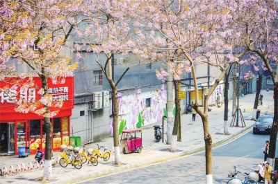 武汉晚报讯(记者陶常宁 通讯员李军 申燕伟 肖彩珍)3月27日,在江汉区八古墩东一巷,78棵泡桐树沿街而立,正值花期。道路入口处的外墙上,一幅以泡桐花为主题的手绘墙画即将完工。手绘花墙与真实的泡桐花道相映成趣,吸引了不少行人驻足拍照留念。