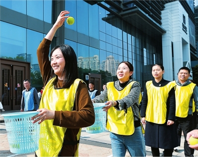 “鸿运当头”项目比赛中,前方选手将网球扔进后方的纸篓。