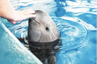 中国科学院水生生物研究所长江江豚繁育研究中心,训练员给长江江豚喂食。