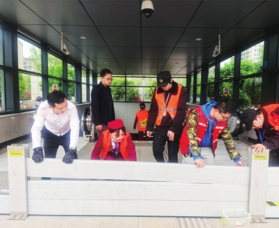 演练现场,随着“暴雨红色预警”信号发出,社区应急队伍与地铁工作人员迅速响应:在地铁出入口拉设警示警戒线,引导过往市民绕行;快速组装并固定防洪挡板,封堵可能进水的通道;在低洼区域有序堆砌沙包,构筑起一道坚实的“防洪墙”。同时,地铁站工作人员通过广播引导站内乘客安全疏散,全程紧张有序,各个环节衔接流畅。社区应急队队员王科说:“这次演练让我们熟悉了地铁站的应急处置流程,并且通过实操演练进一步熟悉了防汛器材的使用技巧,之后能更好地应对汛期突发情况。”