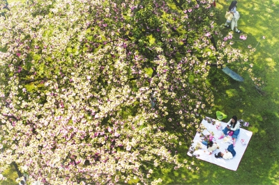 青山公园的晚樱吸引众多市民游客前来踏青赏花,尽享春日美好时光。