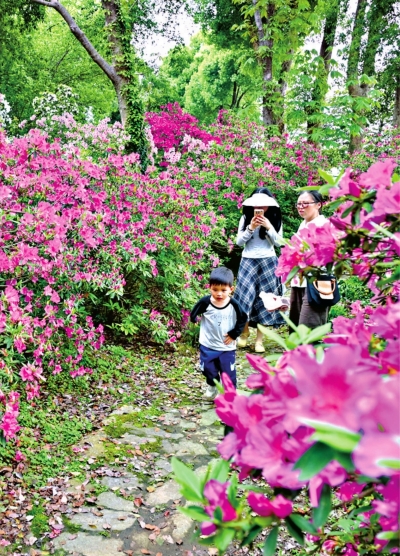 青山公园杜鹃花的盛花期能持续到4月底,本周末是“高光时刻”,想拍大片的市民游客得抓紧了。