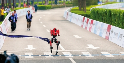 4月19日,人形机器人选手“闪电”(前)在比赛中冲线。