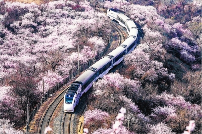 一列客运列车穿行在北京市居庸关长城脚下的花海中。