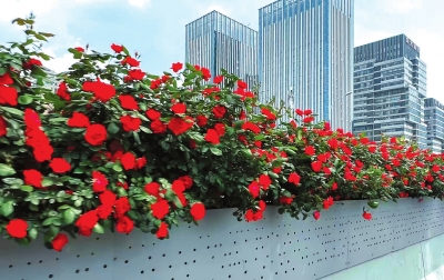 光谷大道高架盛开的“北京红”月季。