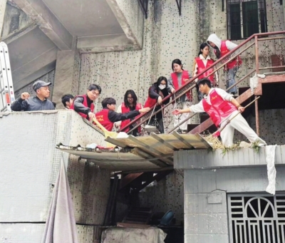 志愿者们齐心合力清理楼道和屋顶垃圾。