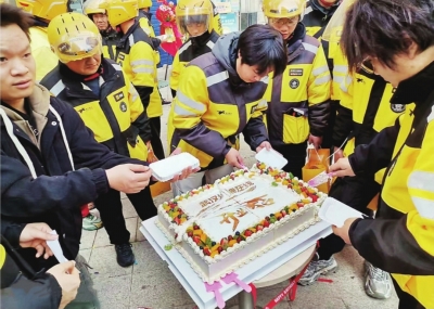 新就业群体的骑手之家新开业,大家一起分享蛋糕。