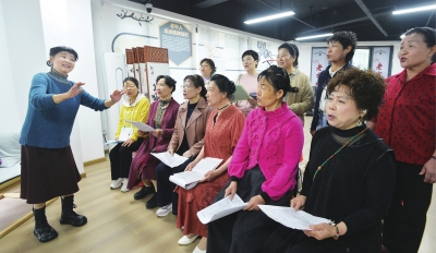 77岁的社区军魂乐团团长陈锐敏在指导居民练习声乐。