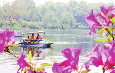 4月18日,游人在武汉市青山公园乘船赏花游览。