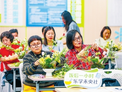 杭州老年人在街道老年学校上花艺课。