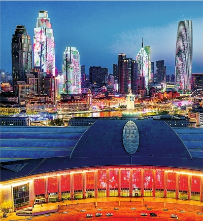 天津站后广场拍摄的以海棠花为主题的灯光秀。