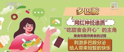 专家介绍,大脑里的“快乐信号”有血清素、多巴胺、内啡肽。其中,血清素需要食物中的色氨酸合成,是情绪的稳定器,给人带来平静、愉悦和满足感。多巴胺是大众熟悉的“网红神经递质”,也是“吃甜食会开心”的主角,因为美食和期待美食的过程会刺激多巴胺分泌,给人带来短暂的快乐。内啡肽属于“天然的止痛药”,在运动、大笑和吃辣后可以刺激产生,给人带来愉悦感,缓解压力与不适。