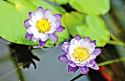 在室外展区,还可以看到少见的双色睡莲。其中“百变女王”万维莎花朵一半嫣红一半鹅黄,色彩比例自然形成,各不相同,故被称为“世界睡莲冠军”。另一个品种“夹克丰”花色红白相间,清新可人。曾获世界睡莲水景园艺协会“最佳睡莲新品种”和“最佳耐寒睡莲”两个一等奖。