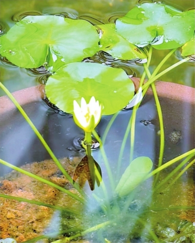 在澳洲巨花睡莲旁边的莲池内,展示了5株世界上花朵最小的睡莲——卢旺达睡莲。这种睡莲又称侏儒睡莲,开着米黄色小花,花朵直径只有1厘米,相当于一粒蚕豆米大小。