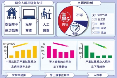 研究团队基于同济医院大数据平台(DPAP)的数据分析,结合程序筛选及人工筛选,发现武汉地区门诊患者中每10万人每年有16.34例新发严重过敏反应病例,且发病率呈现逐年上升的趋势。在有明确诱因的严重过敏反应病例中,药物诱发的病例占比40.7%。其中,抗生素诱发的病例占药物诱发病例的40.6%,即占总病例数的16.5%。